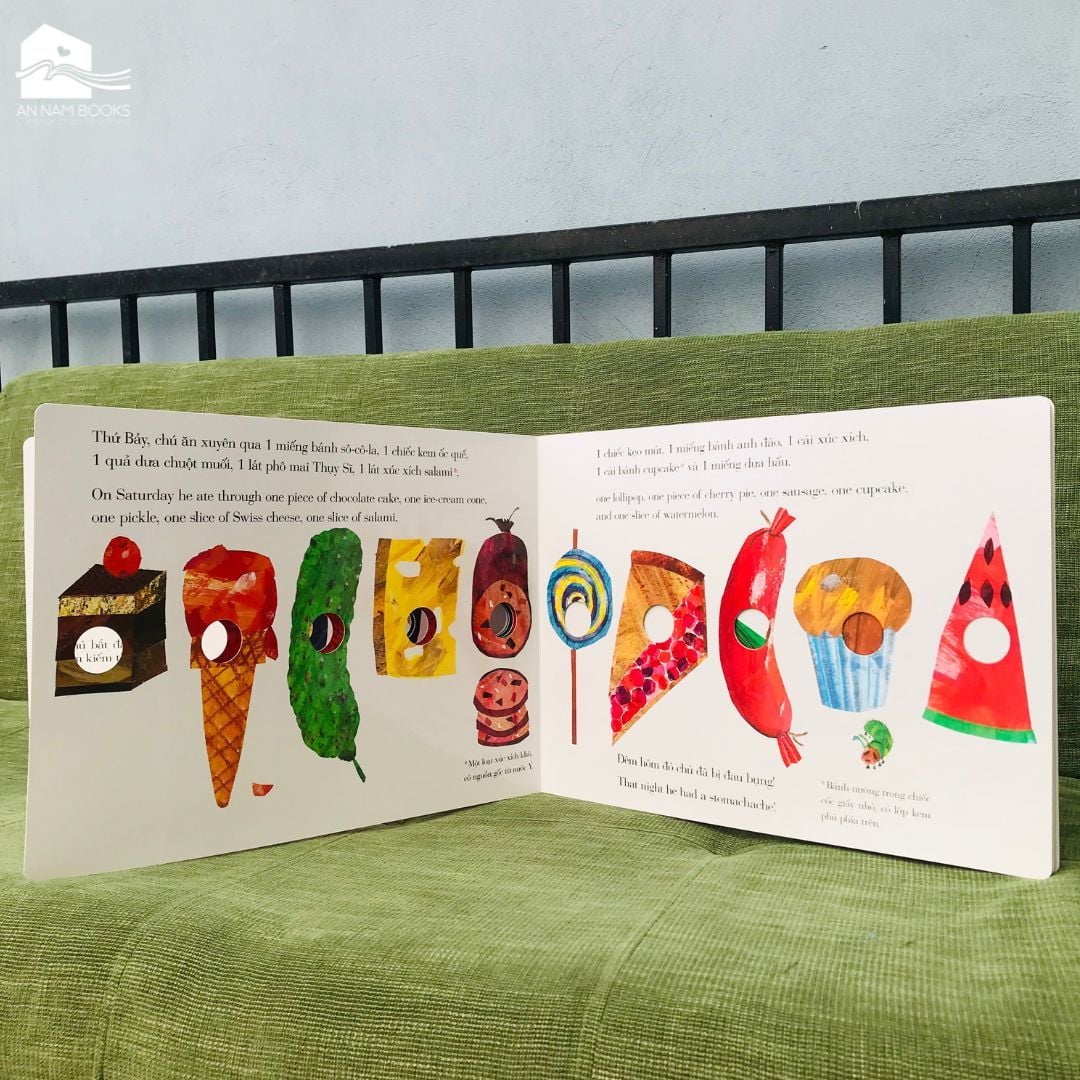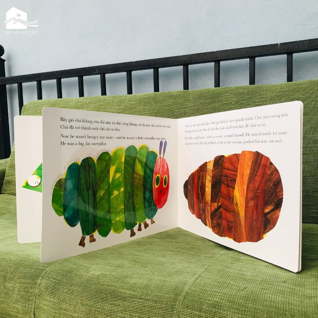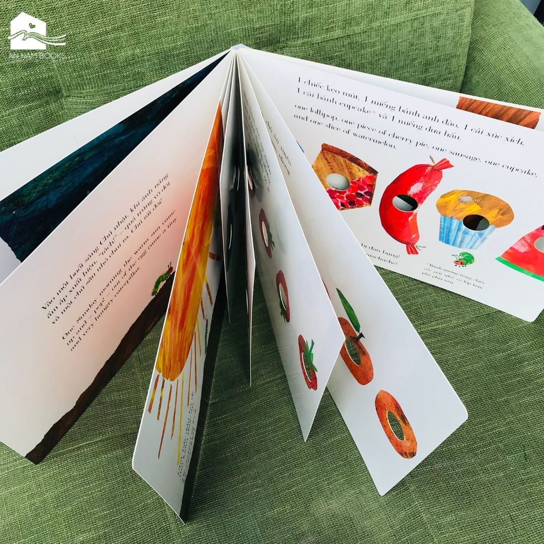 Picture book song ngữ “Chú sâu háu ăn – The very hungry caterpillar” kể về vòng đời của một chú sâu từ lúc còn là quả trứng cho đến khi hóa thành chú bướm xinh đẹp. Từ khi chào đời, lúc nào chú ta cũng cảm thấy đói bụng và luôn bò đi tìm kiếm thức ăn. Mỗi ngày trôi qua, số lượng thực phẩm chú ăn càng tăng lên và điều gì sẽ xảy ra với chú sâu háu ăn này? Câu trả lời sẽ khiến các bé vô cùng bất ngờ. Sức hút đặc biệt của “Chú sâu háu ăn” không chỉ nằm ở nội dung thú vị, gần gũi mà còn ở cách kể chuyện và hình thức vô cùng mới lạ. Cuốn truyện không chỉ giúp trẻ tập đếm, tập nhớ thứ tự các ngày trong tuần mà còn cung cấp nhiều kiến thức khoa học bổ ích. Đây là cuốn truyện đầu tiên trên thế giới được sáng tạo hình cắt dán, đục lỗ độc đáo, vui mắt. Các em nhỏ theo dõi câu chuyện về chú sâu háu ăn dễ dàng cảm nhận được hành trình ăn mọi thứ của chú thông qua những chiếc lỗ đục từ trang này sang trang khác.