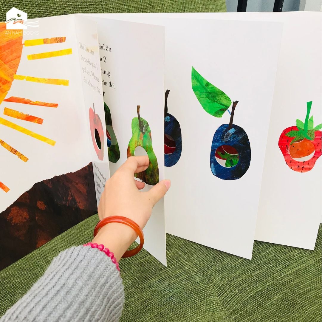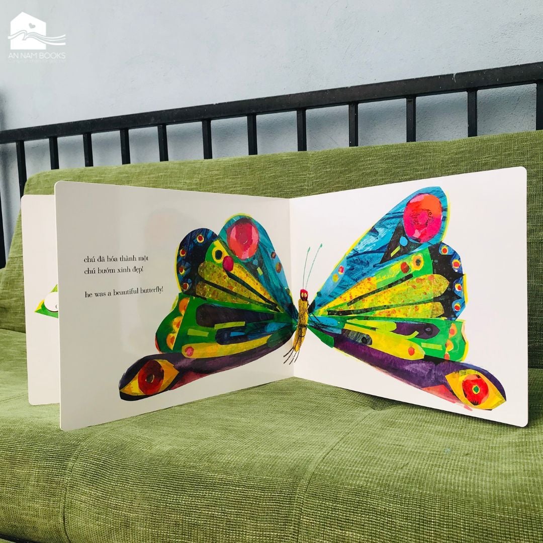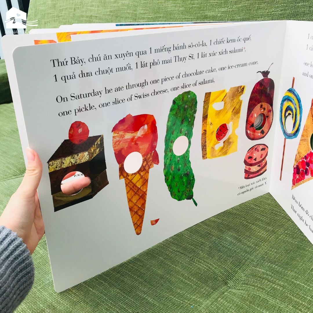 Picture book song ngữ “Chú sâu háu ăn – The very hungry caterpillar” kể về vòng đời của một chú sâu từ lúc còn là quả trứng cho đến khi hóa thành chú bướm xinh đẹp. Từ khi chào đời, lúc nào chú ta cũng cảm thấy đói bụng và luôn bò đi tìm kiếm thức ăn. Mỗi ngày trôi qua, số lượng thực phẩm chú ăn càng tăng lên và điều gì sẽ xảy ra với chú sâu háu ăn này? Câu trả lời sẽ khiến các bé vô cùng bất ngờ. Sức hút đặc biệt của “Chú sâu háu ăn” không chỉ nằm ở nội dung thú vị, gần gũi mà còn ở cách kể chuyện và hình thức vô cùng mới lạ. Cuốn truyện không chỉ giúp trẻ tập đếm, tập nhớ thứ tự các ngày trong tuần mà còn cung cấp nhiều kiến thức khoa học bổ ích. Đây là cuốn truyện đầu tiên trên thế giới được sáng tạo hình cắt dán, đục lỗ độc đáo, vui mắt. Các em nhỏ theo dõi câu chuyện về chú sâu háu ăn dễ dàng cảm nhận được hành trình ăn mọi thứ của chú thông qua những chiếc lỗ đục từ trang này sang trang khác.