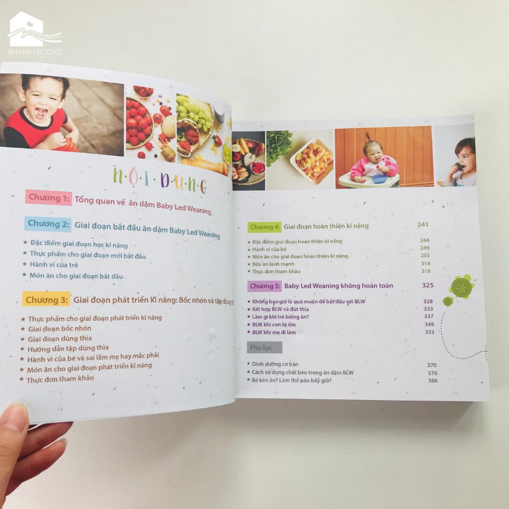 Chương 1: Tổng quan về ăn dặm Baby Led Weaning Chương 2: Giai đoạn bắt đầu ăn dặm Baby Led Weaning Chương 3: Giai đoạn phát triển kĩ năng – Bốc nhón và tập dùng thìa Chương 4: Giai đoạn hoàn thiện Chương 5: Baby Led Weaning không hoàn toàn PHỤ LỤC
