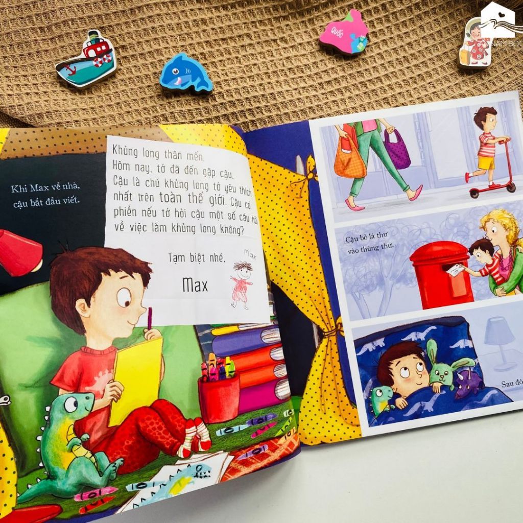 GIỚI THIỆU NỘI DUNG BỘ SÁCH 1 - Giới thiệu sách song ngữ cho bé "Khủng long thân mến" Max được bố mẹ đưa đến tham quan viện bảo tàng, nơi có các chú khủng long mà cậu yêu thích. Khủng long Bạo chúa T. Rex là loài khủng long mà Max yêu thích nhất. Tuy nhiên thời gian tham quan ở bảo tàng không có nhiều mà cậu thì có rất nhiều câu hỏi về những chú khủng long. Và theo lời gợi ý của mẹ, Max đã quyết định về nhà và viết cho T. Rex một bức thư. Liệu T. Rex có nhận được thư của Max không? Nếu có, T. Rex sẽ trả lời như thế nào trước những câu hỏi của Max? Các bé hãy đón đọc cuốn sách song ngữ Khủng long thân mến và khám phá bí mật trong các bức thư của Max và T. Rex nhé.